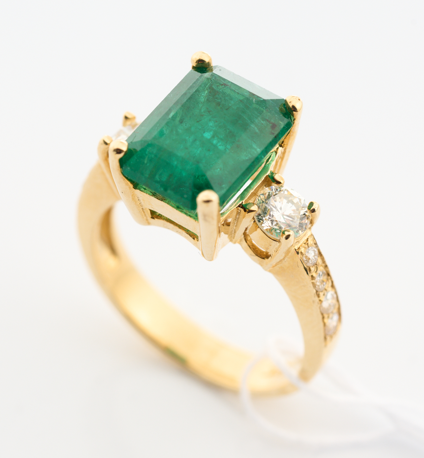 AN EMERALD AND DIAMOND RING - Featuring an emerald cut emerald weighing 4.05cts, flanked by one round brilliant cut diamonds totalling 0.40cts with further diamond detail to shank, in 14ct gold.