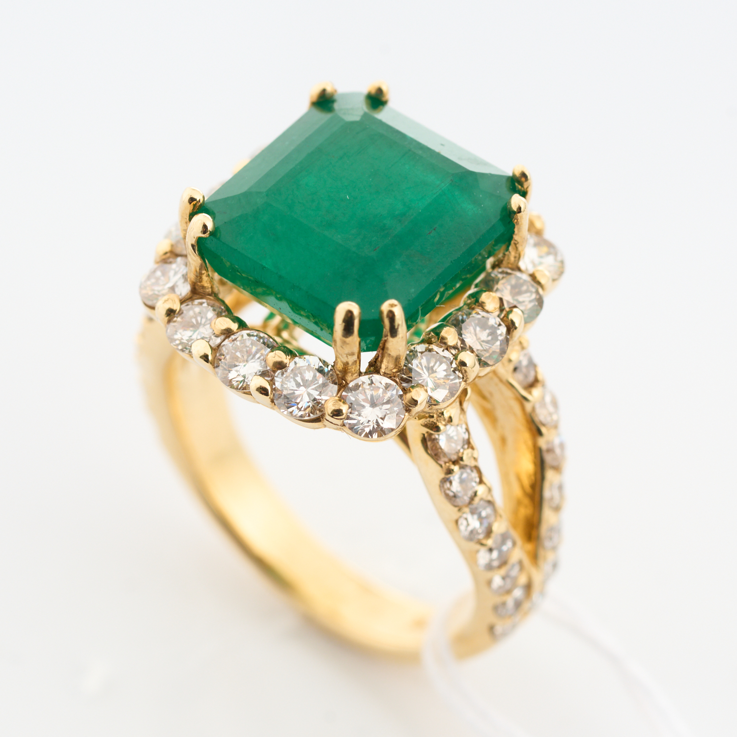AN EMERALD AND DIAMOND RING - Featuring an emerald cut emerald weighing 5.70cts, within a border and shouldered by diamonds totalling 1.93, in 18ct yellow gold.