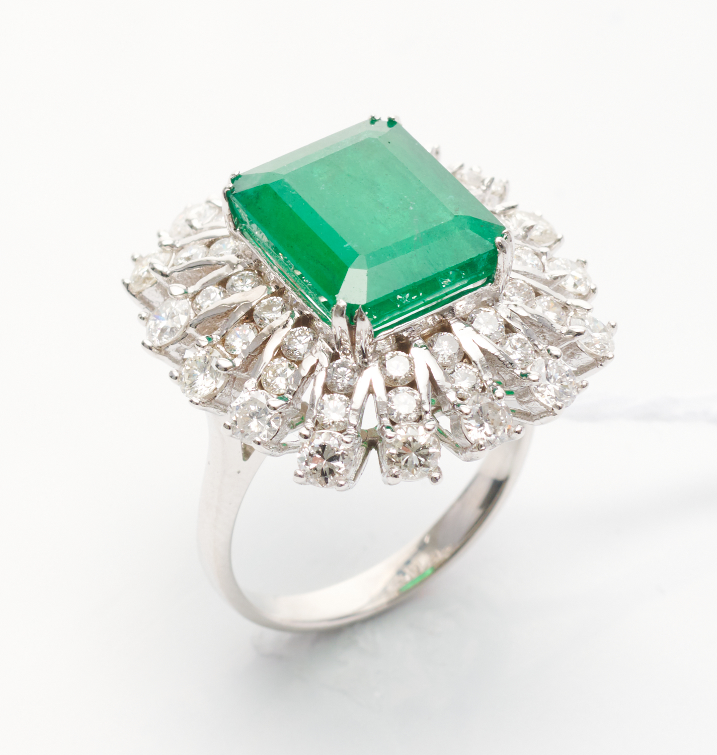 AN EMERALD AND DIAMOND RING - Featuring an emerald cut emerald weighing 5.40cts, within an spray setting set with diamonds totalling 2.40cts, in 18ct white gold.