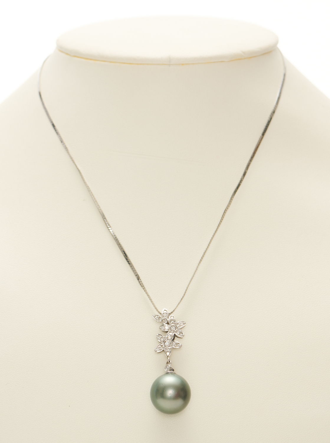 A TAHITIAN PEARL AND DIAMOND PENDANT IN 18CT WHITE GOLD, THE ROUND PEARL MEASURING 14.5MM, LENGTH OF THE PENDANT 35MM, TO STERLING SILVER CHAIN