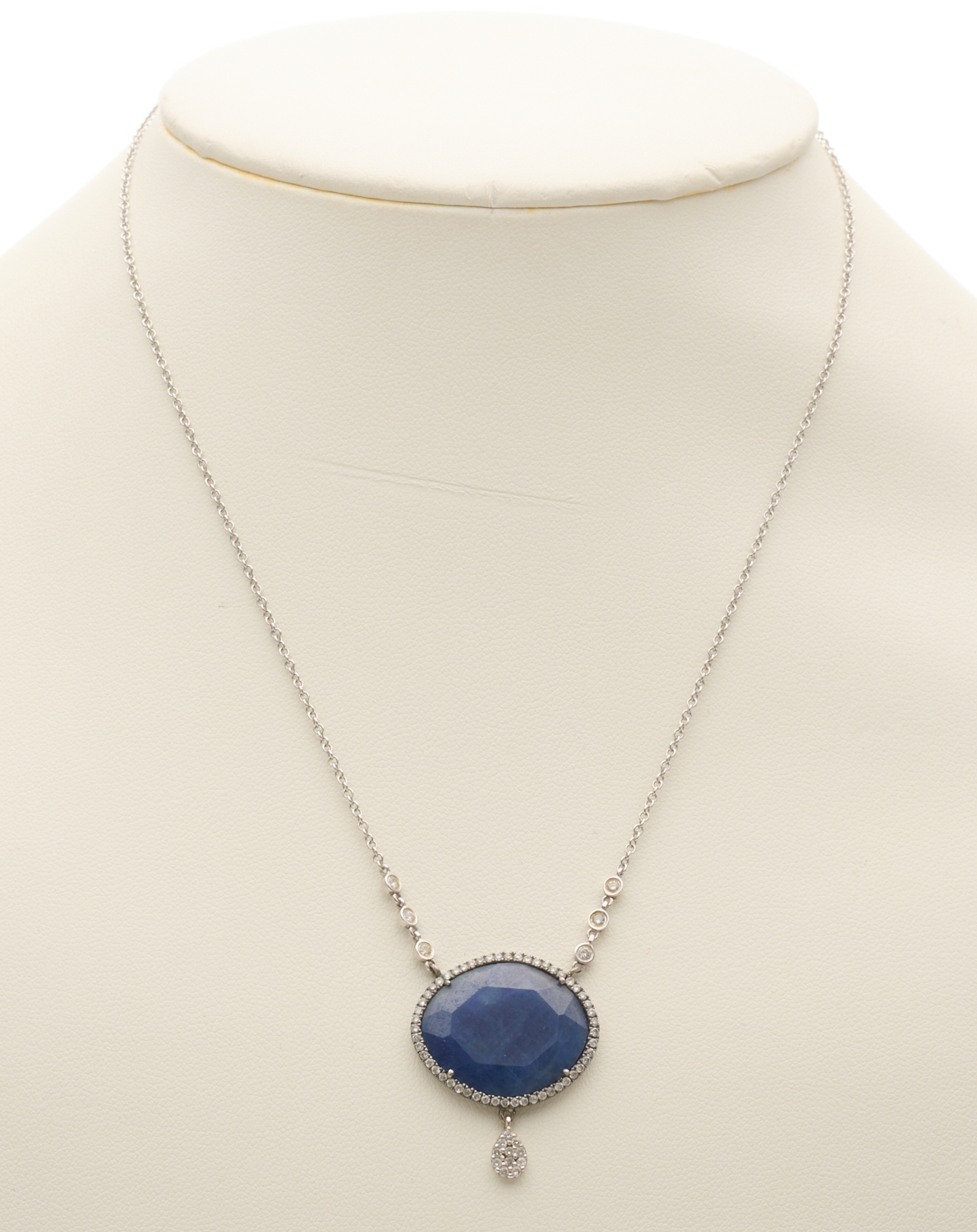 A SAPPHIRE AND DIAMOND NECKLACE IN SILVER