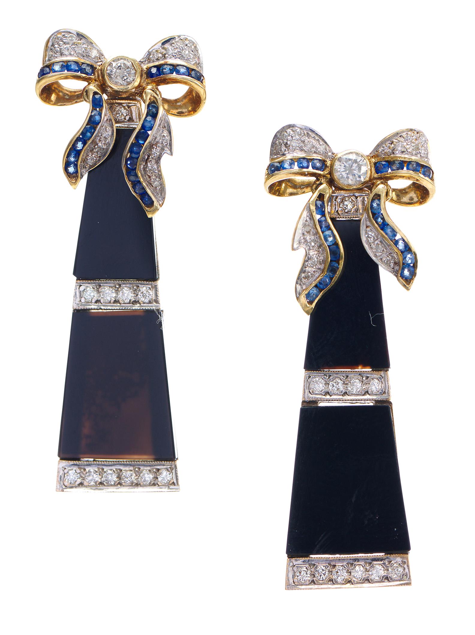 A PAIR OF ONYX AND DIAMOND BOW EARRINGS, TO POST AND BUTTERFLY FITTINGS IN 14CT GOLD, 42MM,