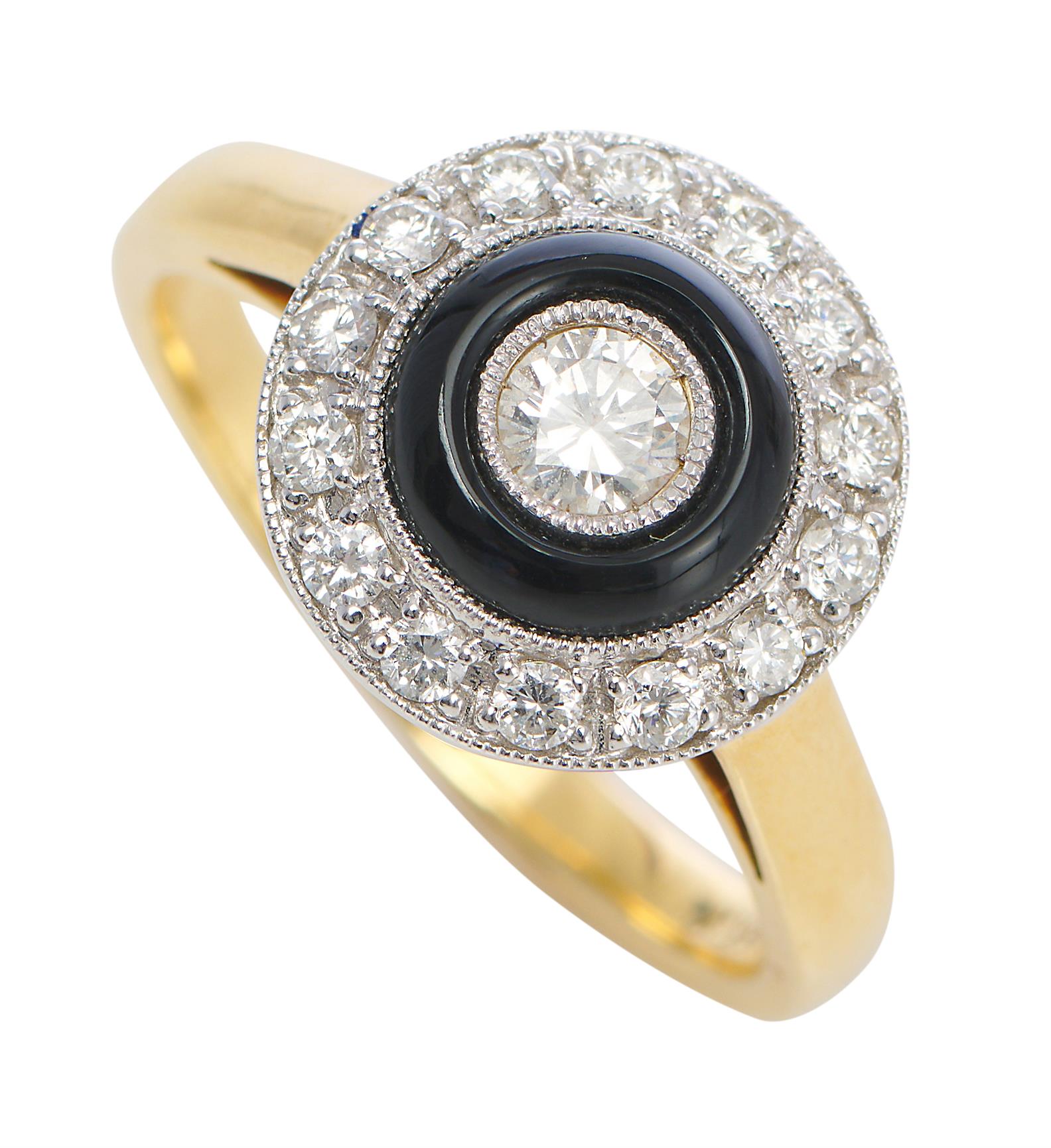 AN ART DECO STYLE ONYX AND DIAMOND RING IN TWO TONE 18CT GOLD, RING SIZE O/P, 5.8GMS