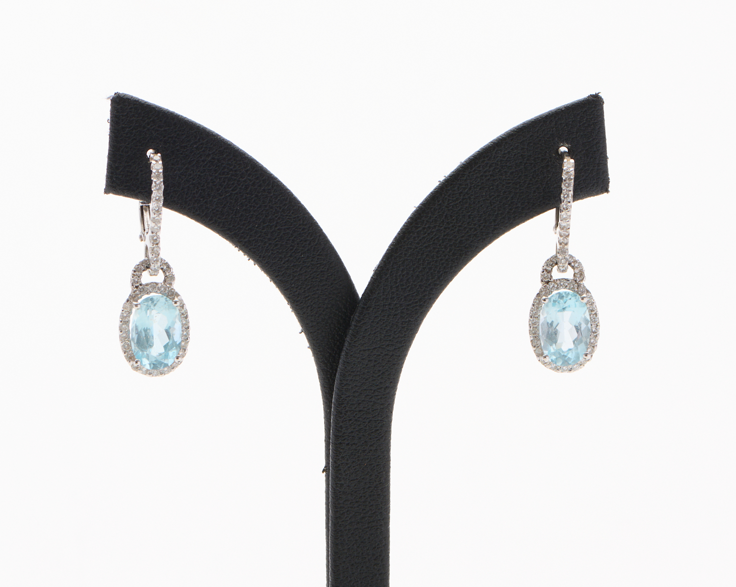 A PAIR OF AQUAMARINE AND DIAMOND EARRINGS IN 18CT WHITE GOLD, TO POST FITTINGS