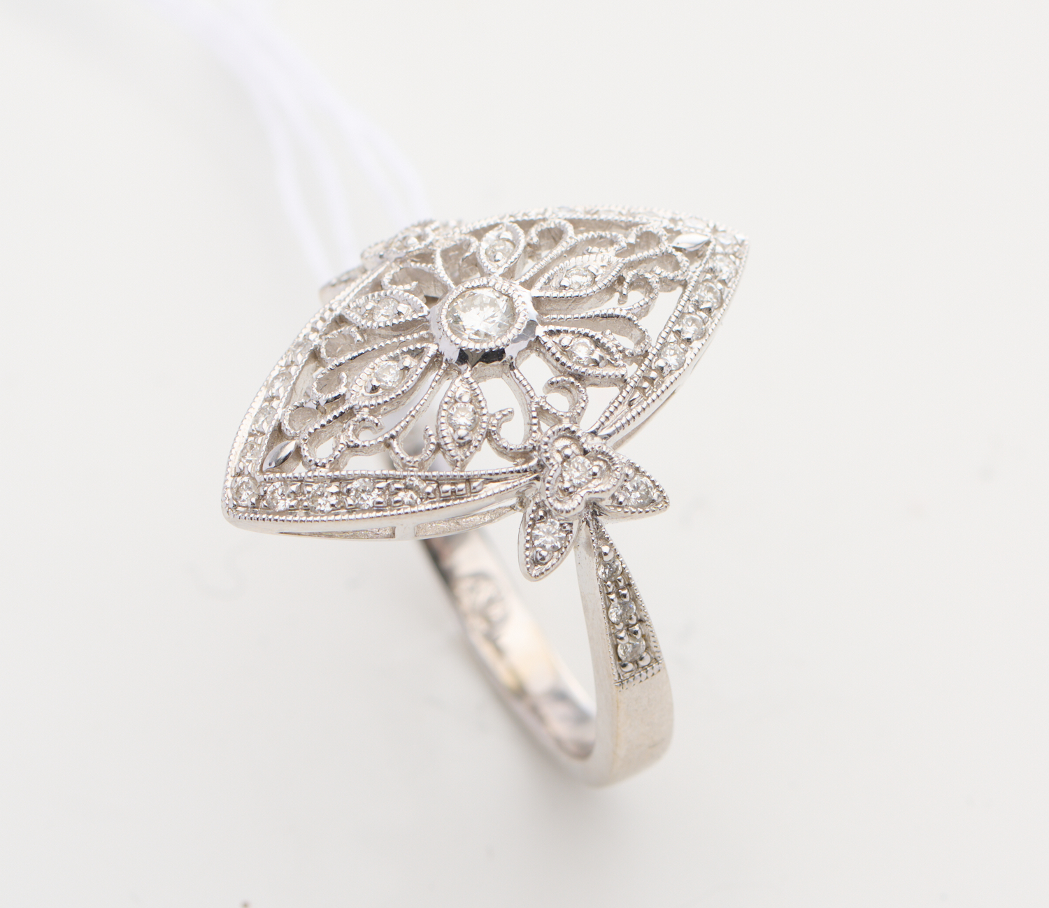 AN ART DECO STYLE DIAMOND RING IN 18CT WHITE GOLD FEATURING OPENWORK DESIGN, SIZE R, 6.5GMS
