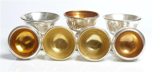 All with floriate motifs, five with a gilt interior, raised on circular feet