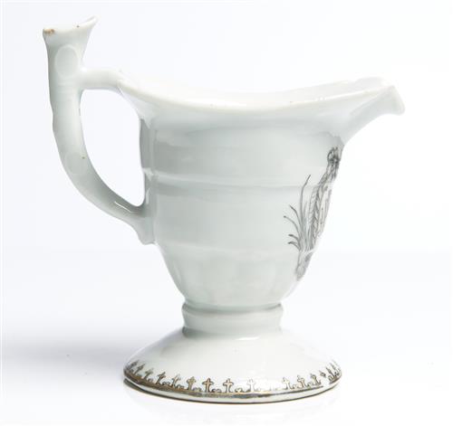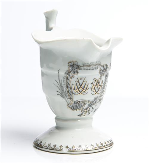 A CHINESE EXPORT ARMORIAL PORCELAIN HELMET-FORM CREAMER