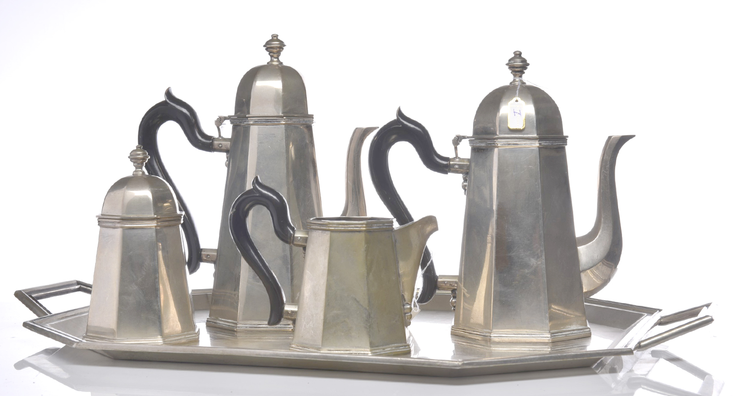 AN 800 SILVER ART DECO FIVE PIECE TEA SET 4.05KG, LEONARD JOEL LOCAL DELIVERY SIZE: SMALL