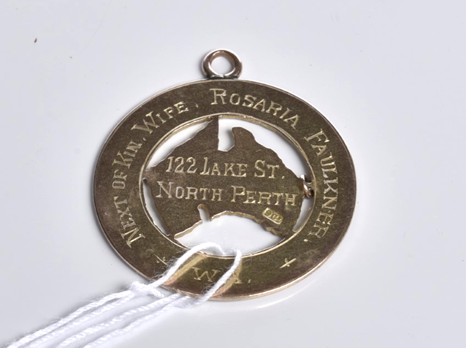 WW1 9CT YELLOW GOLD PENDANT "W.G.FAULKNER" MENTIONED IN BATTLE OF HAMEL JULY 1918, LEONARD JOEL LOCAL DELIVERY SIZE: SMALL