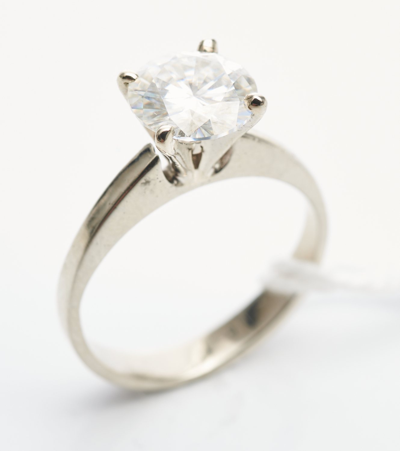 A SOLITAIRE MOISSANITE RING IN 18CT WHITE GOLD, SIZE K, 2.4GMS