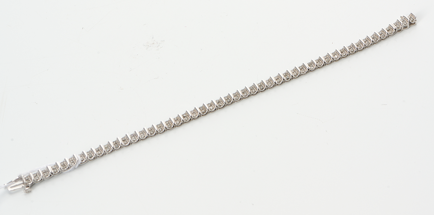 A DIAMOND LINE BRACELET IN 18CT WHITE GOLD, COMPRISING SIXTY FOUR ROUND BRILLIANT CUT DIAMONDS TOTALLING 5.34CTS, TOTAL LENGTH 180MM