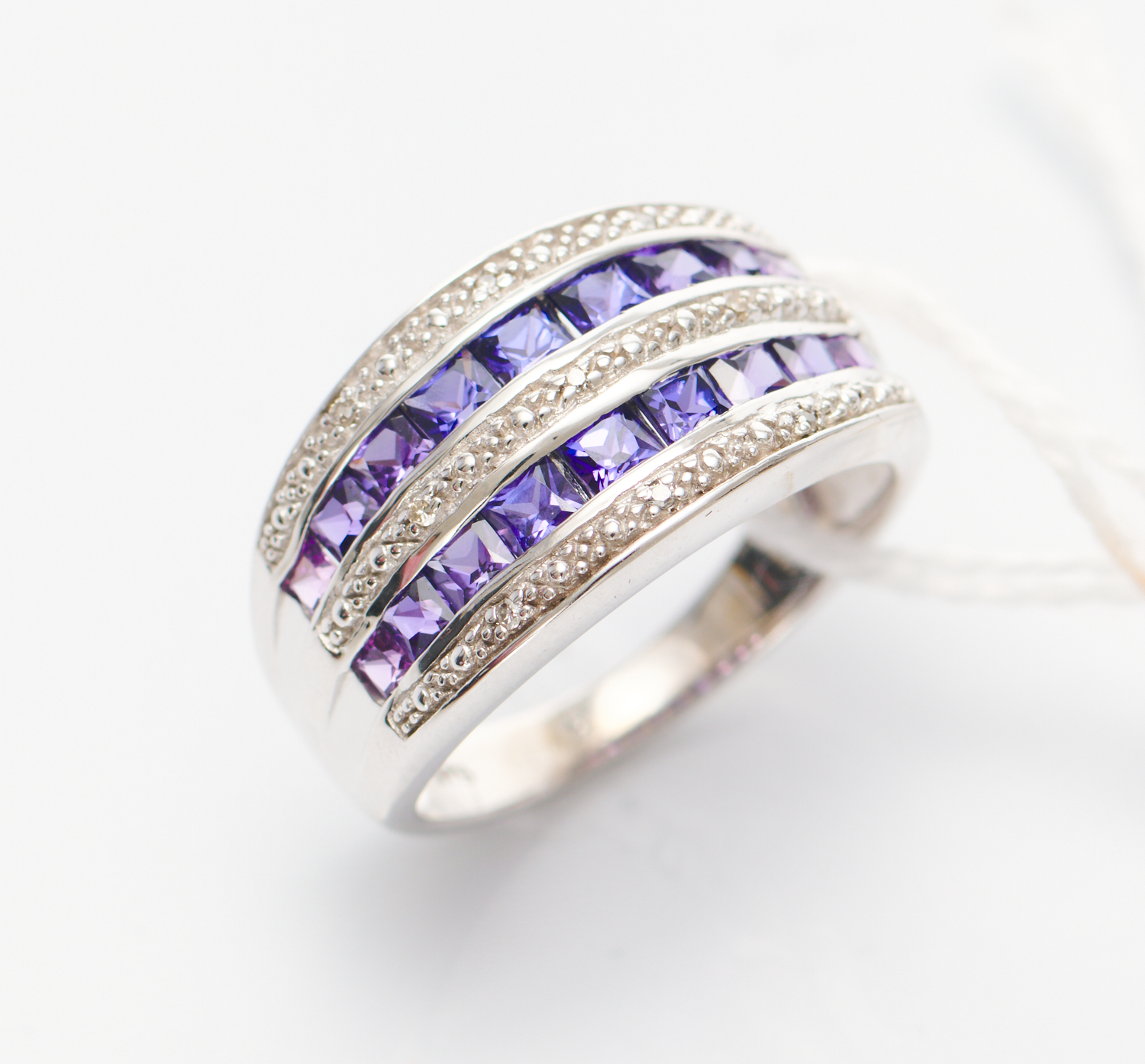 A DIAMOND AND PURPLE STONE RING IN 9CT WHITE GOLD, SIZE K-L, 4.4GMS