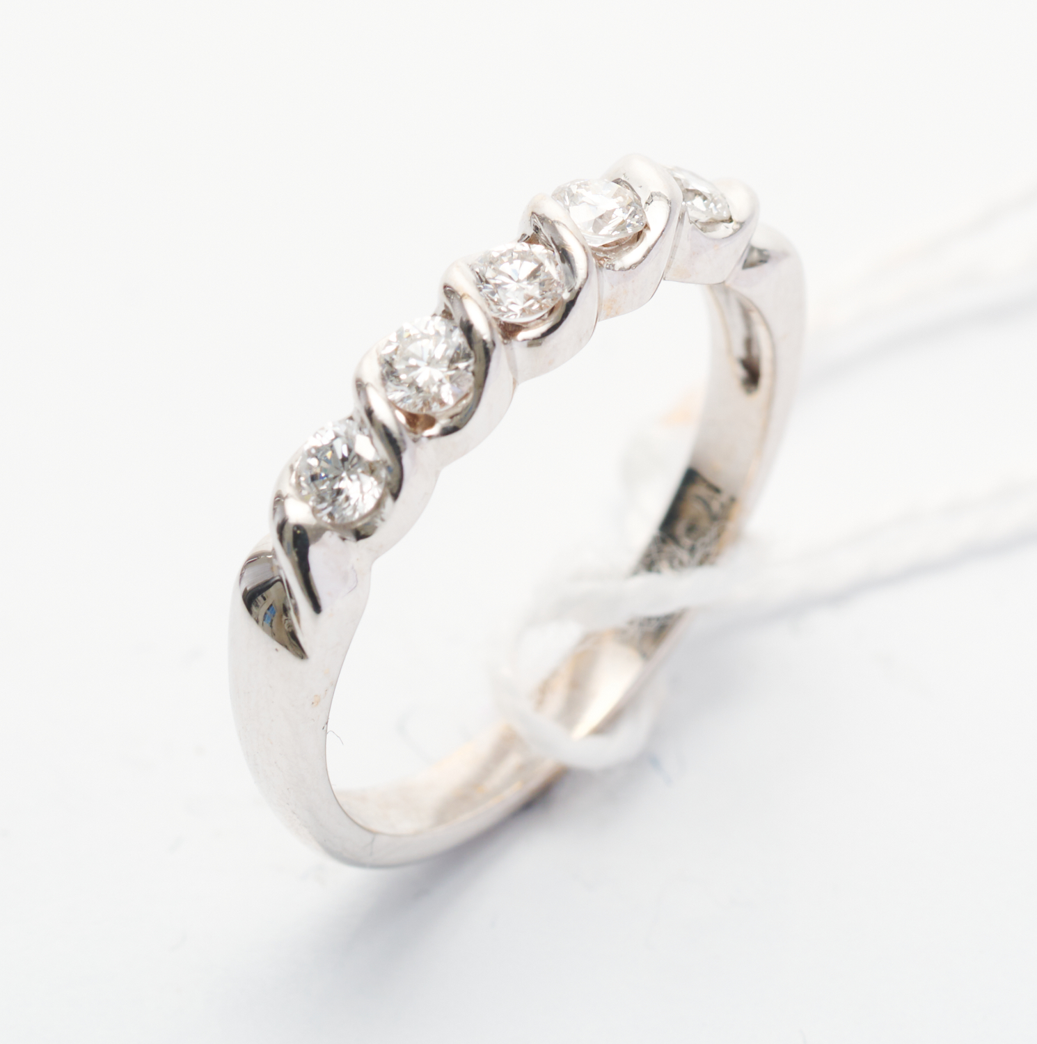 A FIVE STONE DIAMOND RING IN 18CT WHITE GOLD, SIZE N, 3.3GMS