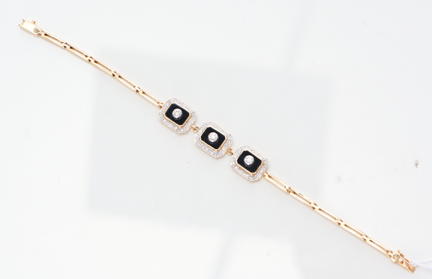 AN ART DECO INSPIRED DIAMOND AND ONYX BRACELET IN 9CT GOLD, TOTAL DIAMOND WEIGHT ESTIMATED 0.74CT, LENGTH 18CMS, 11.3GMS