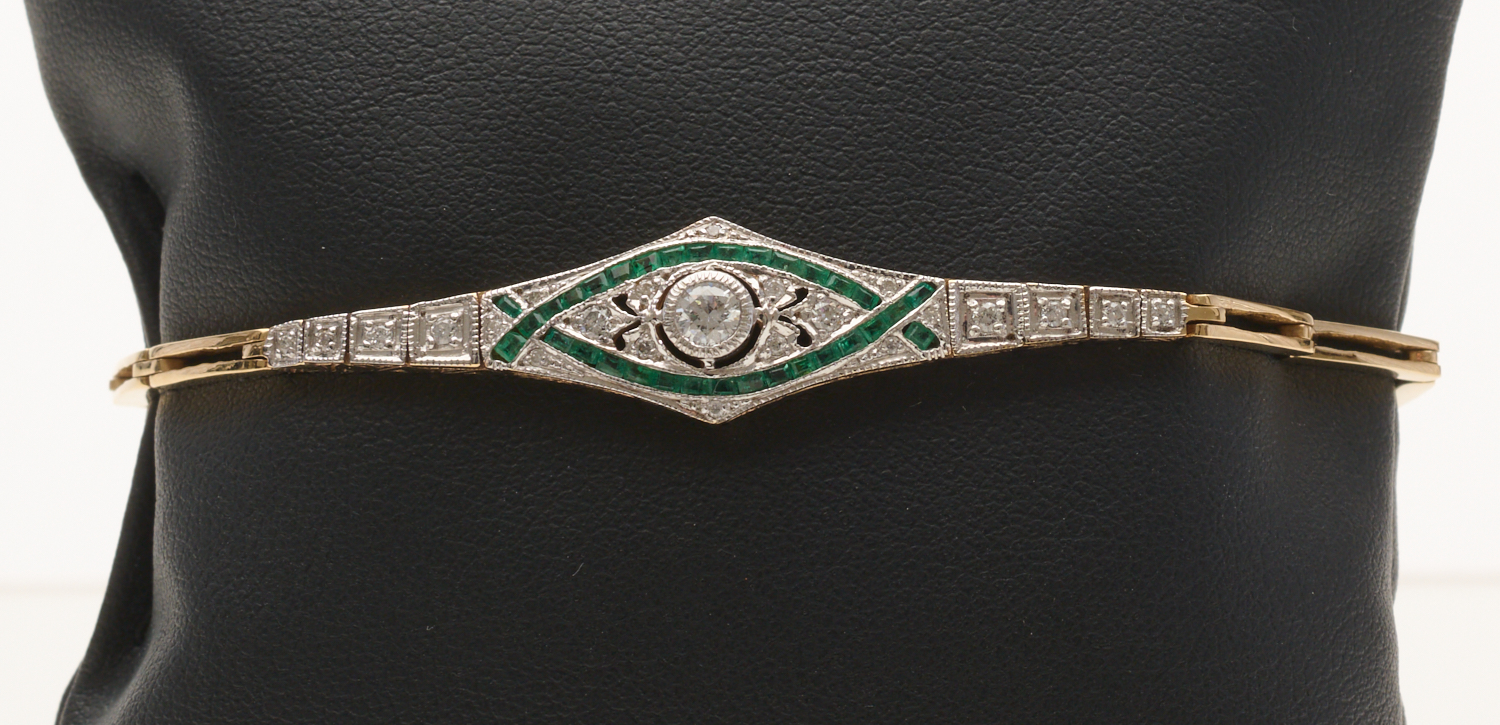 AN ART DECO STYLE EMERALD AND DIAMOND BRACELET IN TWO TONE 9CT GOLD, THE DIAMONDS TOTALLING 0.35CT AND EMERALDS ESTIMATED 0.40CT, LENGTH 18CMS, 8GMS