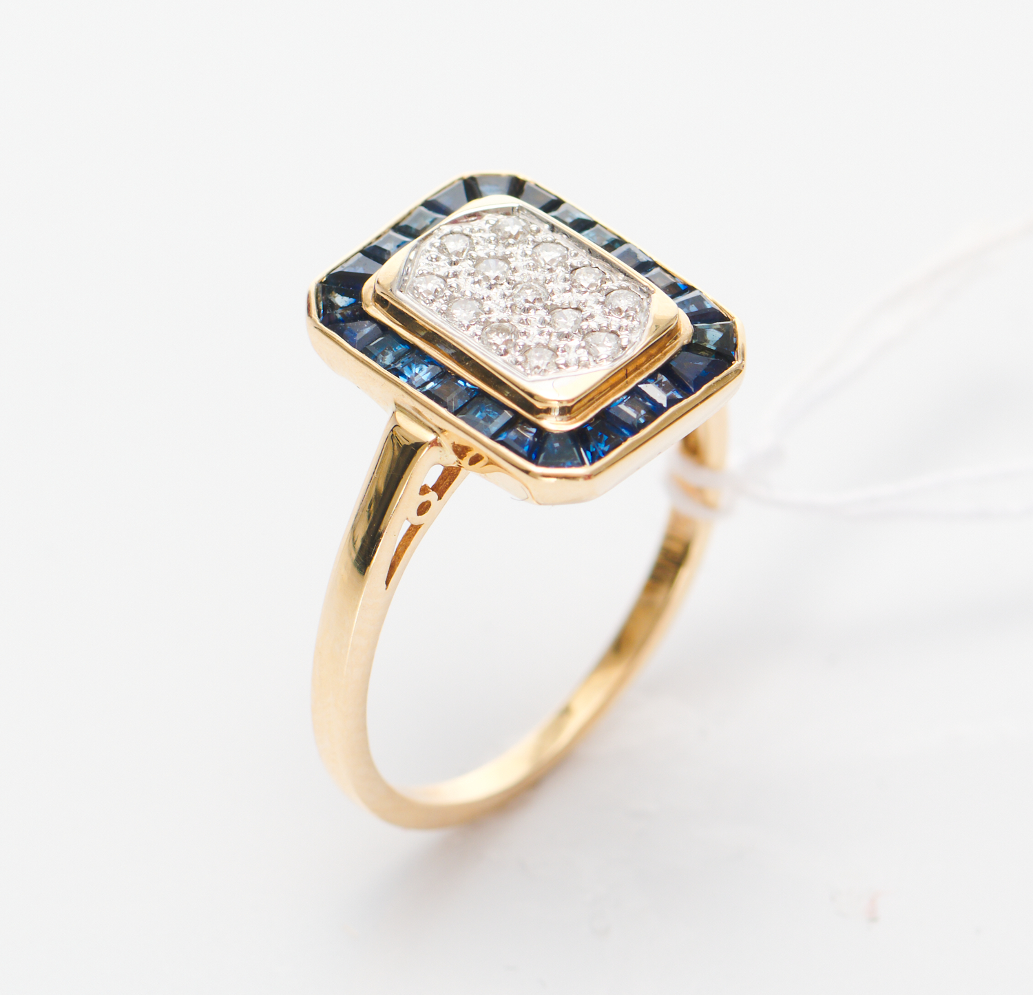 A ART DECO INSPIRED SAPPHIRE AND DIAMOND RING IN 9CT GOLD, THE SAPPHIRES TOTALLING 0.90CT AND DIAMONDS ESTIMATED 0.13CT, SIZE N-M, 3.4GMS