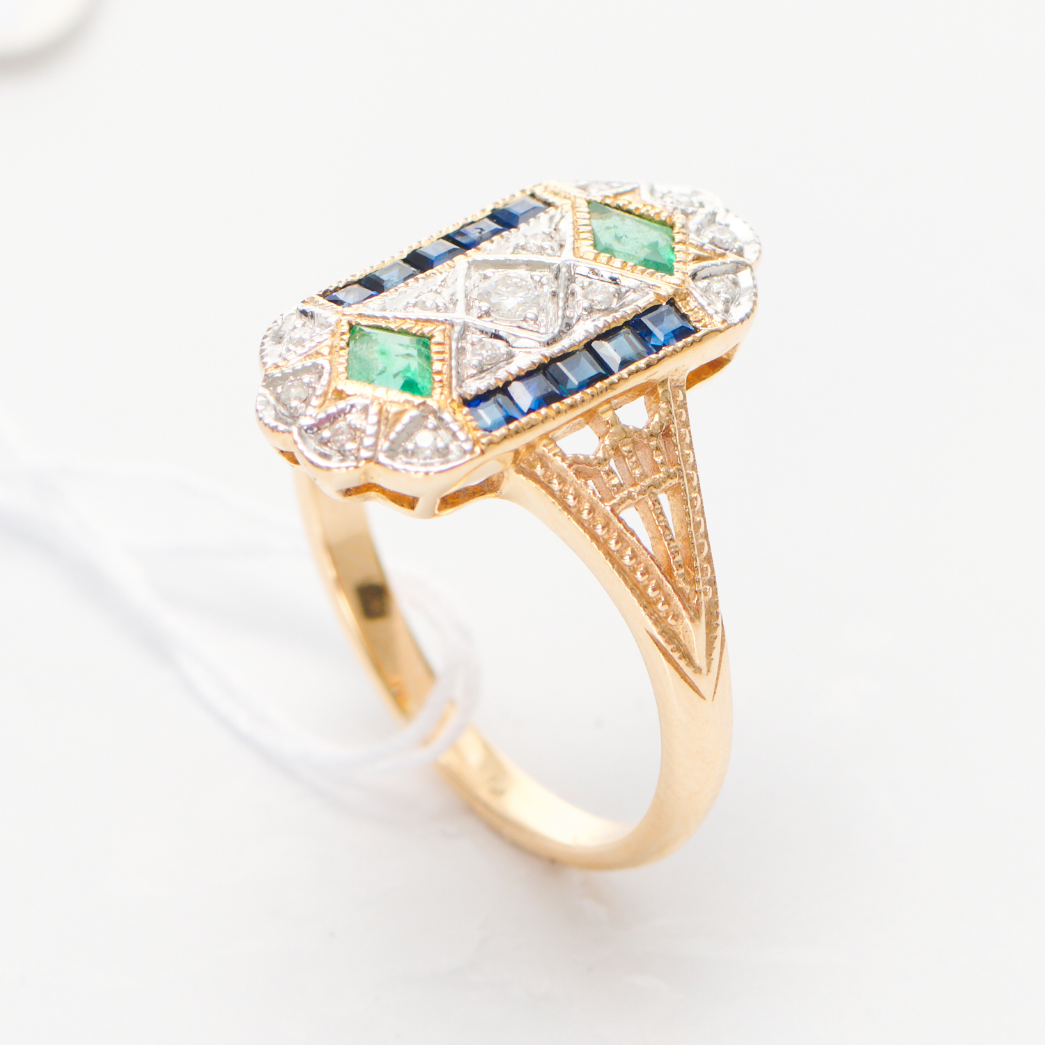 AN ART DECO STYLE PLAQUE RING IN 9CT GOLD, COMPRISING EMERALD, SAPPHIRE AND DIAMONDS,SIZE N, 3.4GMS