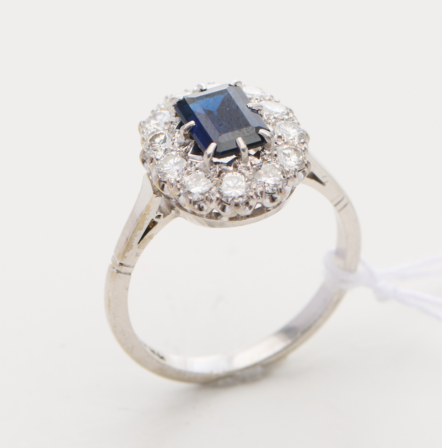 A SAPPHIRE AND DIAMOND RING The cushion shaped plaque featuring an oval sapphire weighing 2.02cts, within a surround of round brilli...