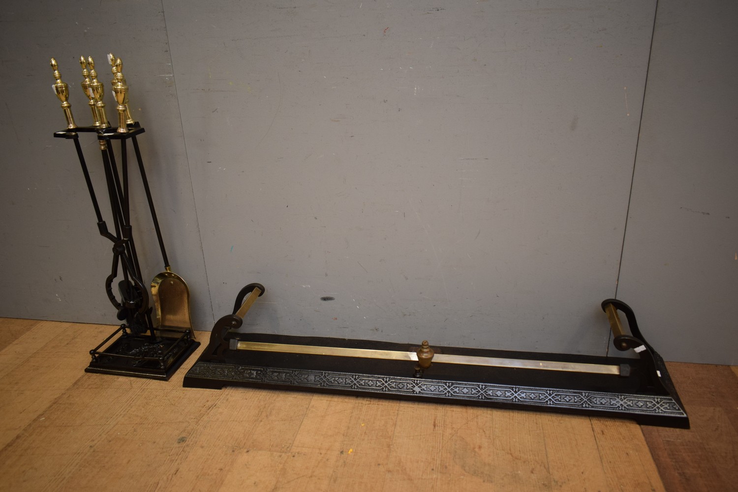 A CAST IRON FIRE GUARD AND FIRE TOOLS (20H X 120W X 27D CM) (LEONARD JOEL DELIVERY SIZE: SMALL)