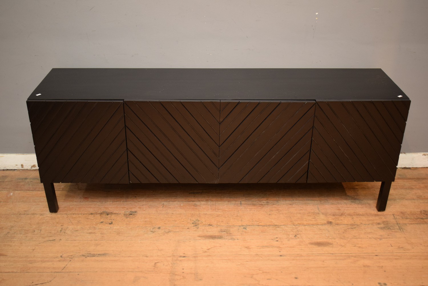 A CHEVRON DESIGN BLACK TEAK SIDEBOARD (96H x 195W x 46D CM) (PLEASE NOTE THIS HEAVY ITEM MUST BE REMOVED BY CARRIERS AT THE CUSTOMER'S EXPENSE. LEONARD JOEL STAFF CANNOT ASSIST CARRYING THIS ITEM) (X-LARGE ITEM)