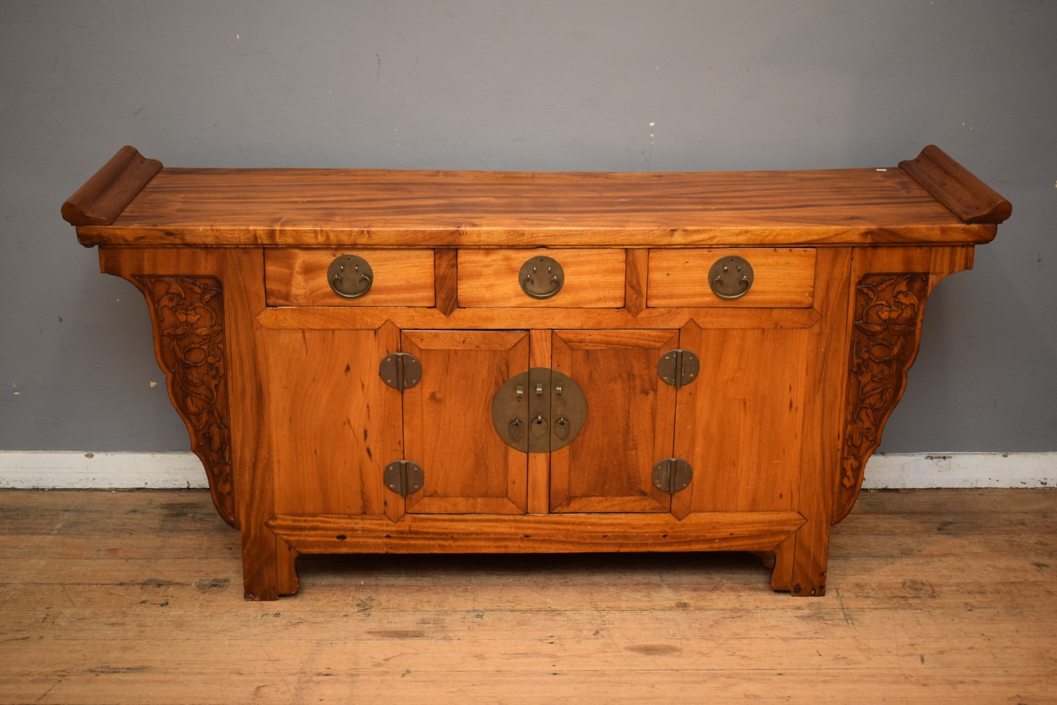 A SUBSTANTIAL THREE DRAWER CHINESE SIDEBOARD (86H X 187W X 47D CM) (PLEASE NOTE THIS HEAVY ITEM MUST BE REMOVED BY CARRIERS AT THE CUSTOMER'S EXPENSE. LEONARD JOEL STAFF CANNOT ASSIST CARRYING THIS ITEM) (X-LARGE ITEM)