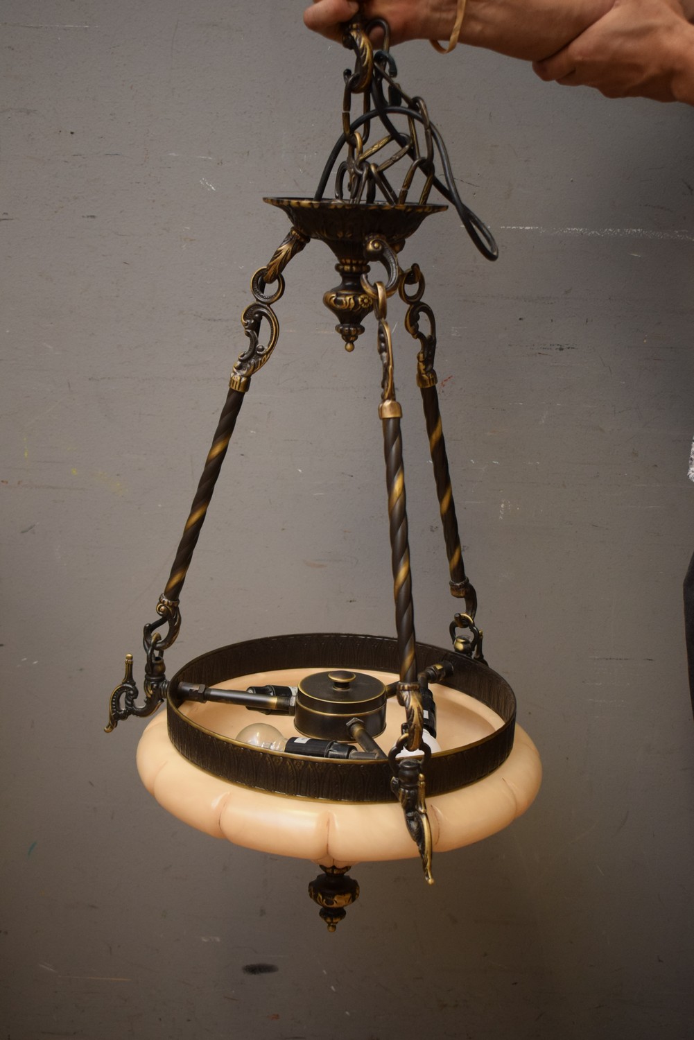 A BRASS PENDANT WITH ALABASTER SHADE, MADE IN SPAIN (A/F NEEDS REWIRING) (LEONARD JOEL DELIVERY SIZE: SMALL) (97H X 47D APPROX CM)