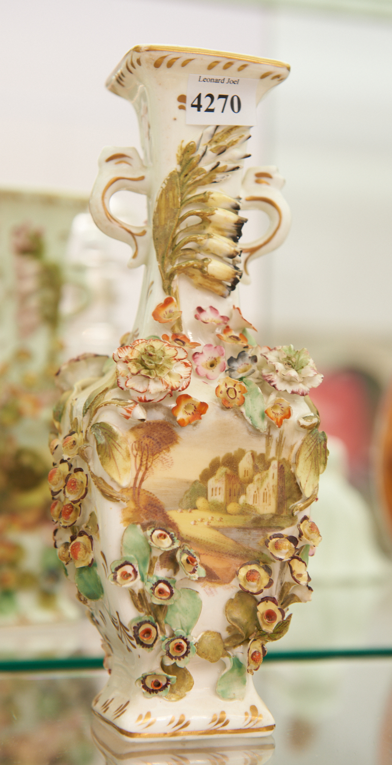 The baluster body painted to either side with a landscape scene, within floral encrusted surrounds (losses), rising to scroll handles