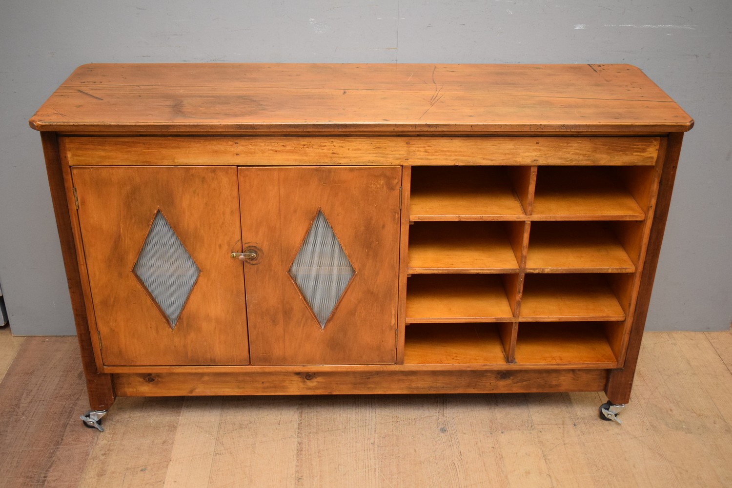 A MID-CENTURY BUFFET WITH DIAMOND CUT OUT DETAILING, TWO SIDED, ON CASTORS (89H X 149W X 46D CM)