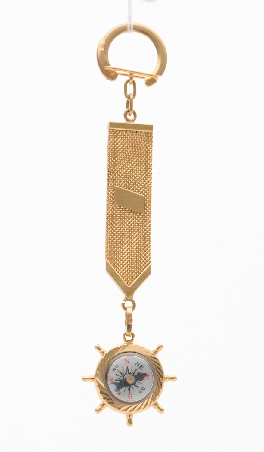 A COMPASS KEY RING IN 18CT GOLD, TOTAL LENGTH 12CMS, TOTAL WEIGHT 19.5GMS