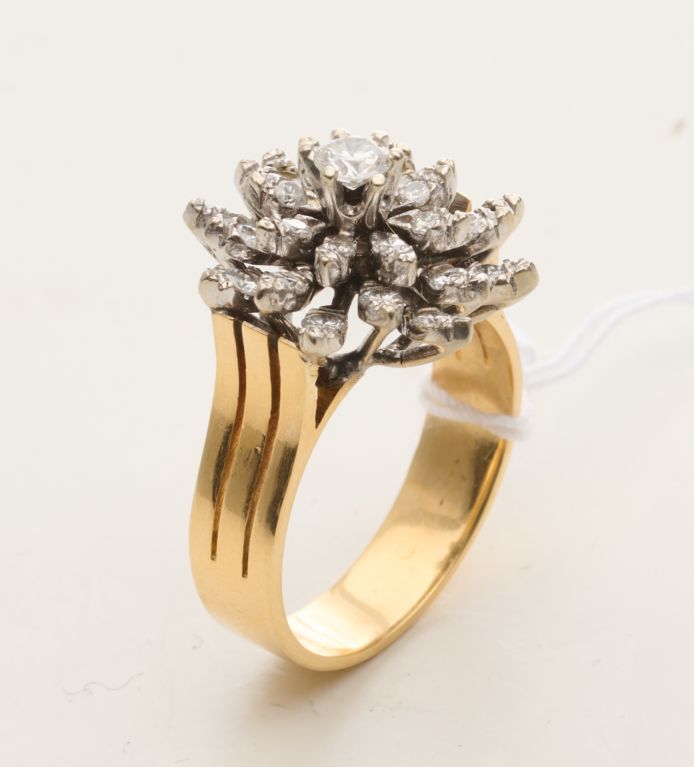 A DIAMOND CLUSTER RING IN 18CT GOLD AND PALLADIUM, SIZE T, 11.3GMS