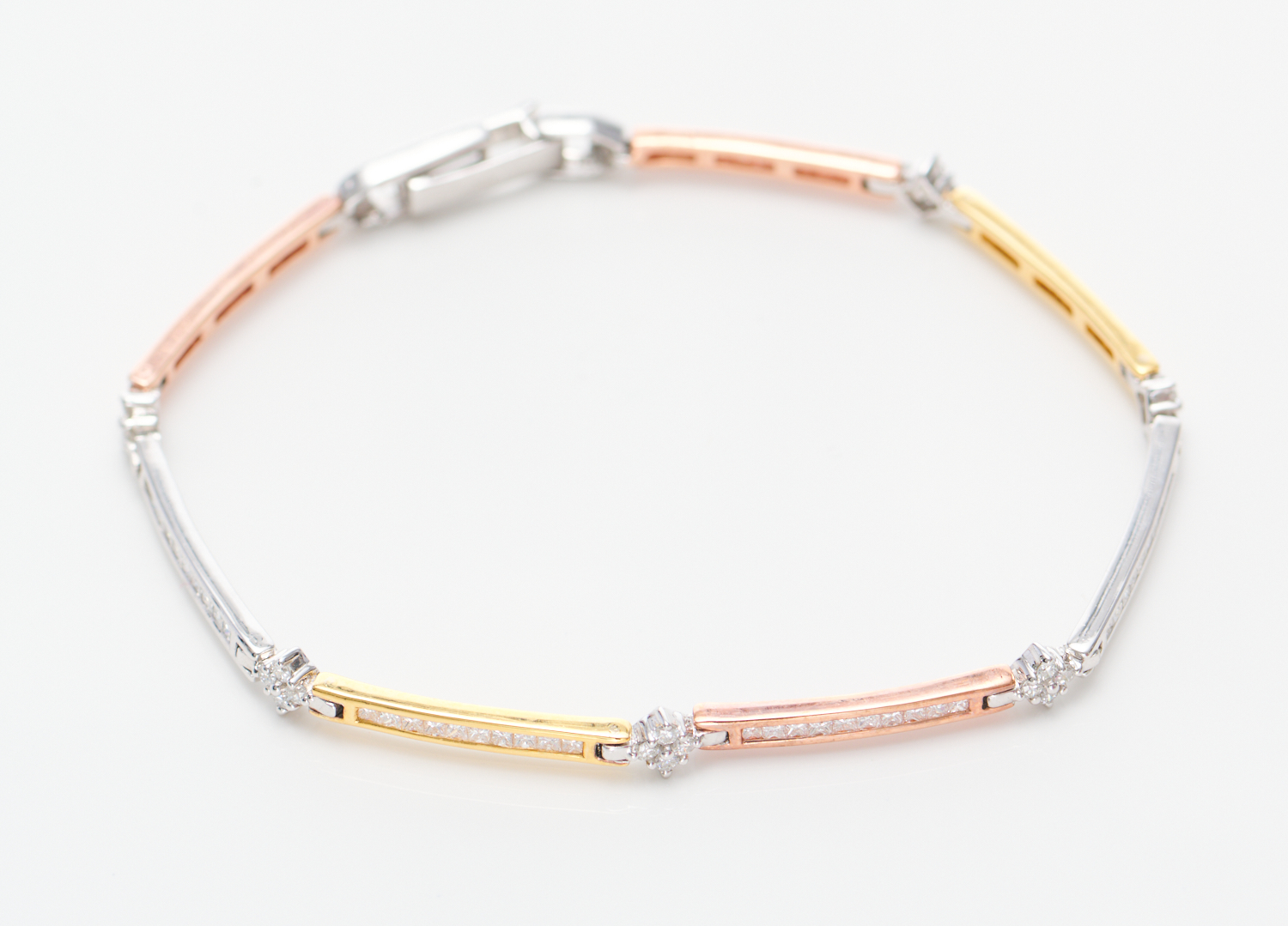 A DIAMOND ARTICULATED BRACELET IN TRI-COLOURED 18CT GOLD, LENGTH 17CMS