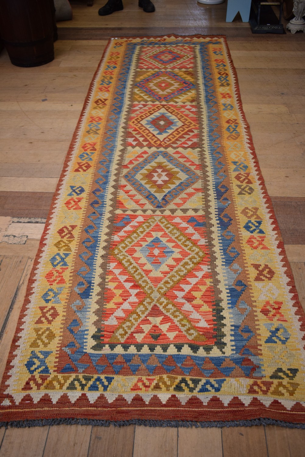 A KILIM FLOOR RUNNER IN TONES OF RED, YELLOW AND BLUE (300 X 90 CM) (LEONARD JOEL DELIVERY SIZE: MEDIUM)