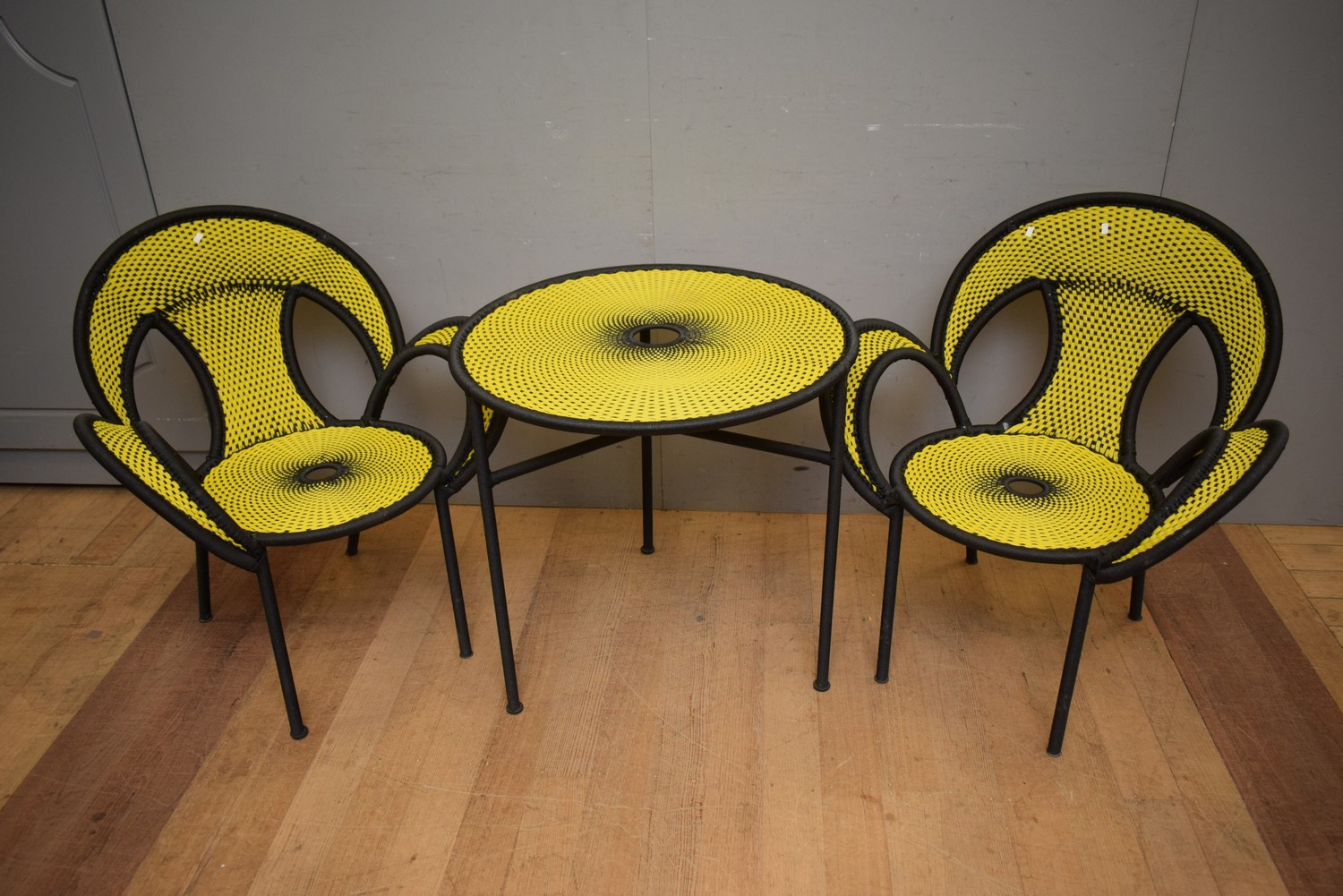 A MODERN THREE PIECE YELLOW AND BLACK EFFECT SETTING (CHAIRS 89H X 81W CM) (LEONARD JOEL DELIVERY SIZE: LARGE)