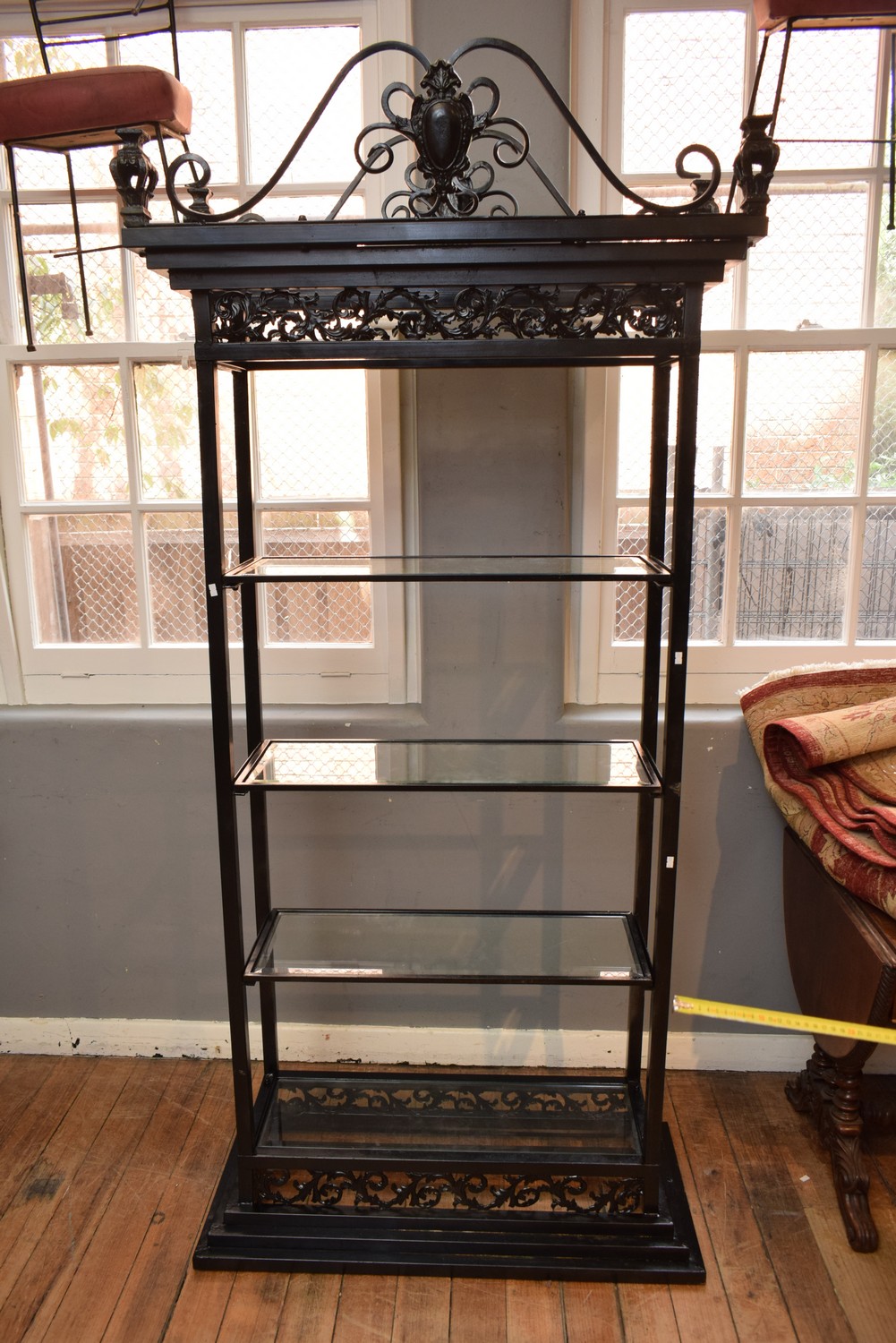AN ORNATE METAL FOUR TIER DISPLAY SHELF (A/F) (222H X 105W X 48D CM) (PLEASE NOTE THIS HEAVY ITEM MUST BE REMOVED BY CARRIERS AT THE CUSTOMER'S EXPENSE. LEONARD JOEL STAFF CANNOT ASSIST CARRYING THIS ITEM) (X-LARGE ITEM)