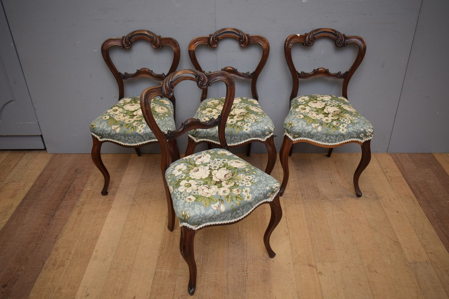 A SET OF FOUR CARVED VICTORIAN DINING CHAIRS (A/F) (H83 X W46 X D49 CM) (LEONARD JOEL DELIVERY SIZE: LARGE)