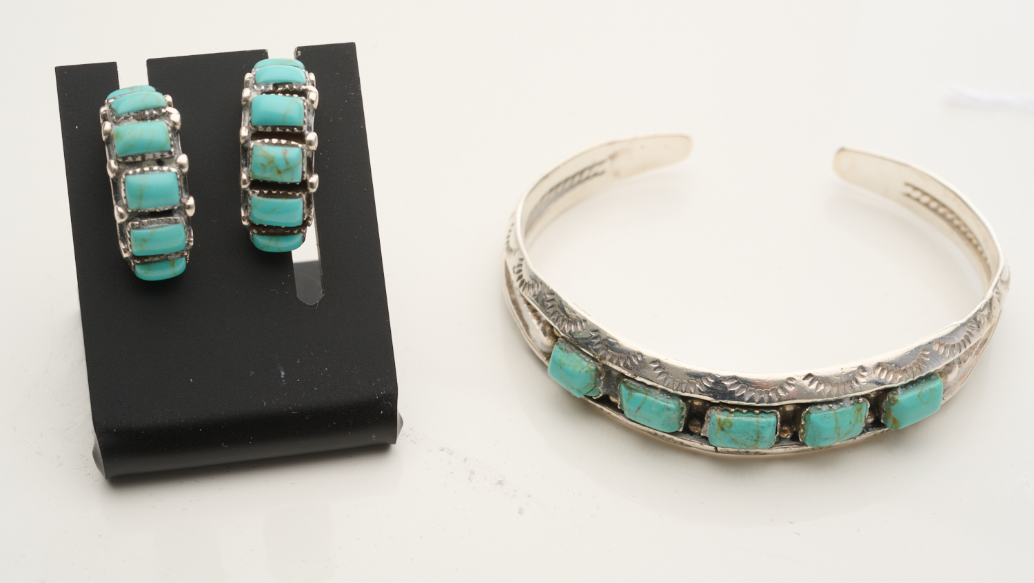 A TURQUOISE JEWELLERY SUITE IN STERLING SILVER, COMPRISING A CUFF BANGLE AND A PAIR OF EARRINGS (POST FITTINGS)