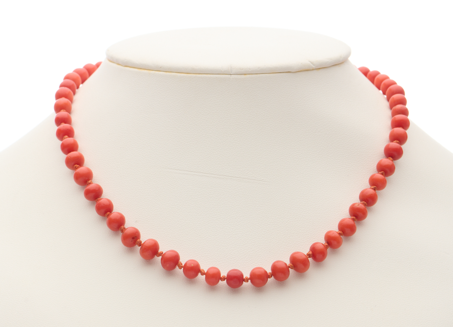 A CORAL BEAD NECKLACE TO A GOLD CLASP, LENGTH 40CM