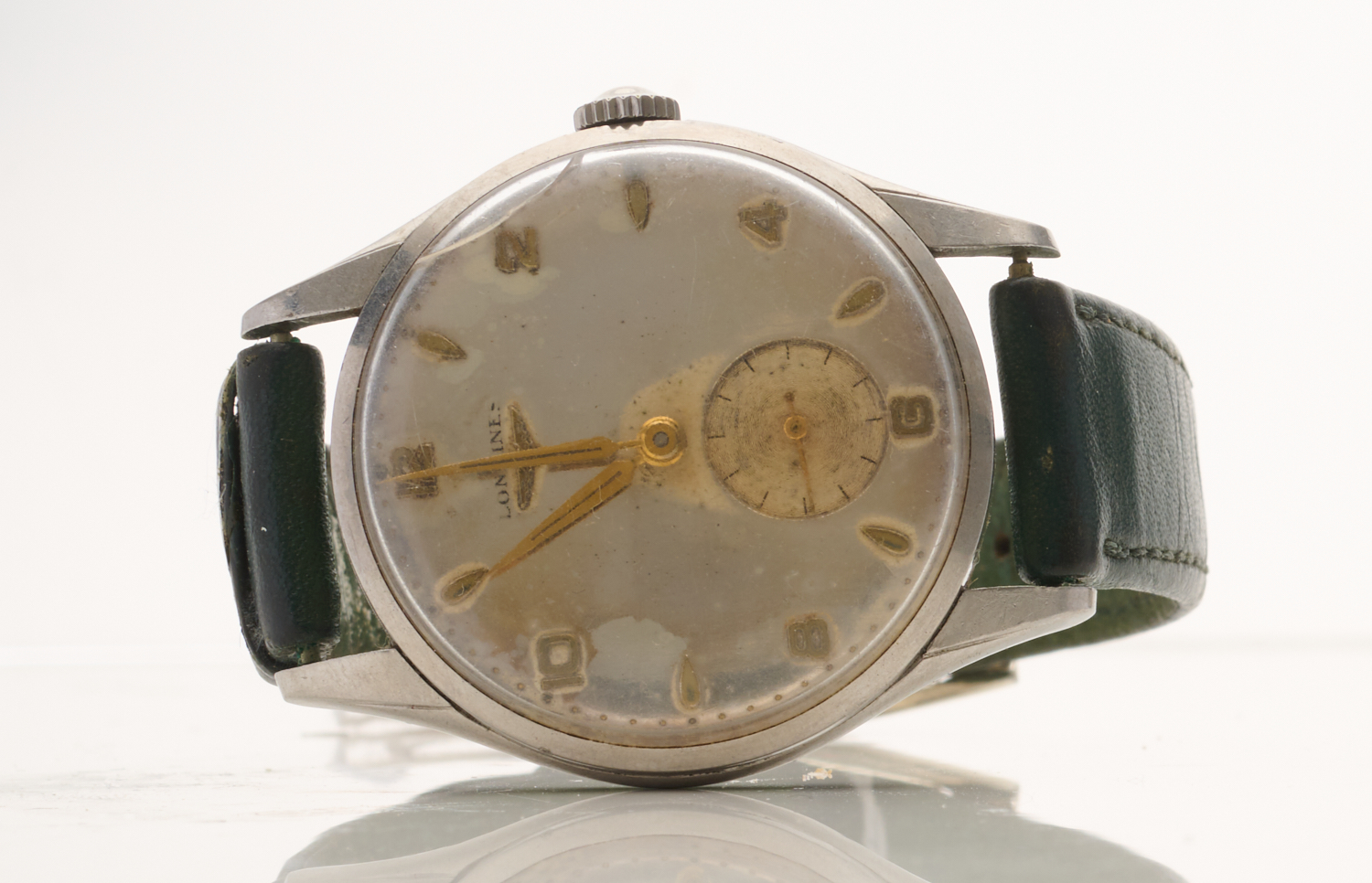 A VINTAGE LONGINES MANUAL WIND WRISTWATCH, DIAL 35MM, TO GREEN LEATHER BANDS