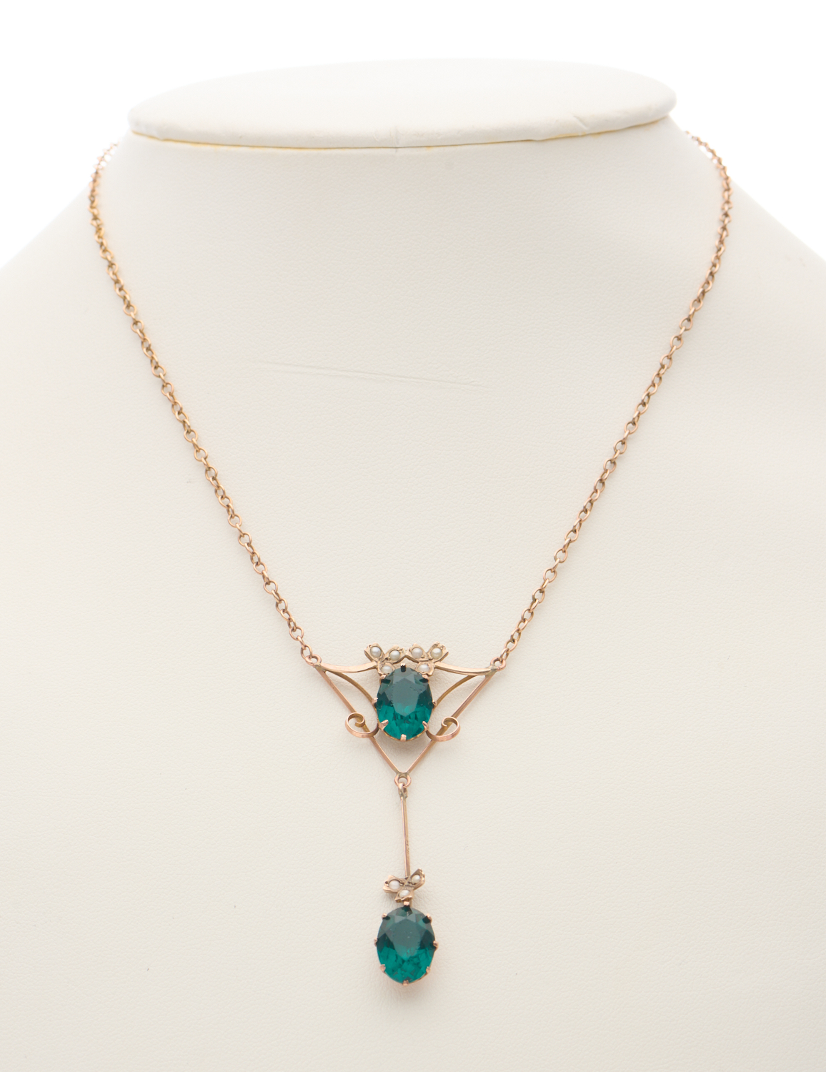 AN EDWARDIAN SEED PEARL AND GREEN PASTE NECKLACE IN 9CT GOLD, LENGTH 39CMS, 5.9GMS