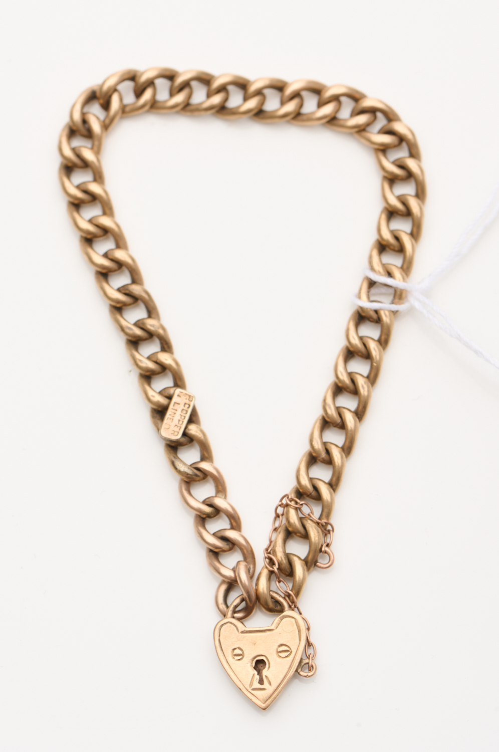 A COPPER LINED CHILDS FANCY LINK HEART PADLOCK BRACELET, THE HEART PADLOCK IN 9CT GOLD, LENGTH 15CMS