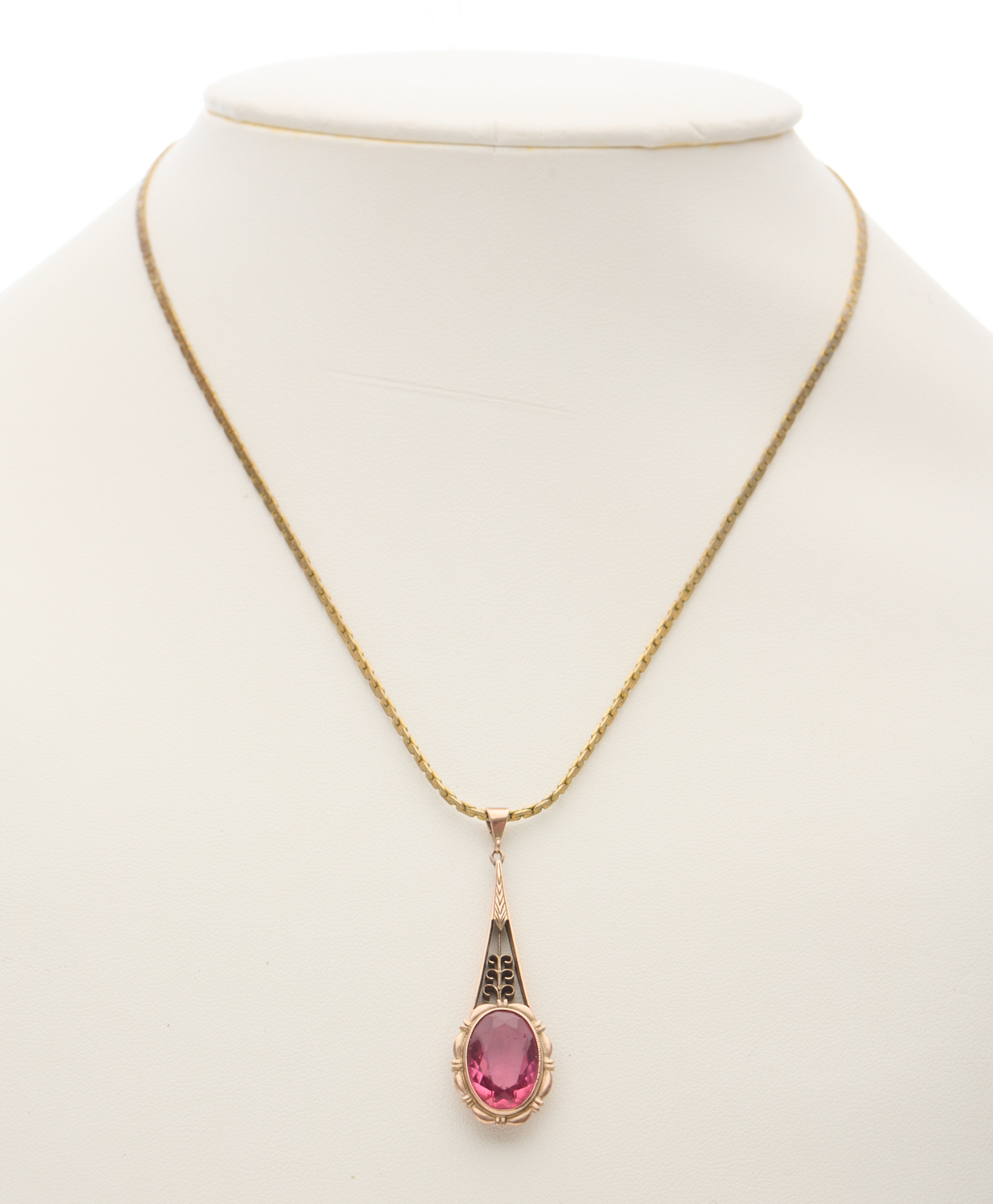 AN EDWARDIAN PASTE SET PENDANT IN 9CT GOLD, TO A DISPLAY CHAIN, THE PENDANT HALLMARKED, LENGTH OF THE PENDANT 40MM