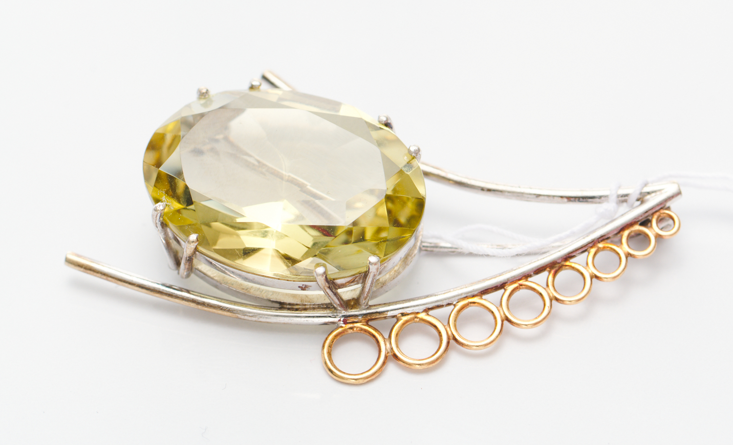 A LEMON QUARTZ BROOCH IN TWO TONE 9CT GOLD, LENGTH 5CMS, 19GMS