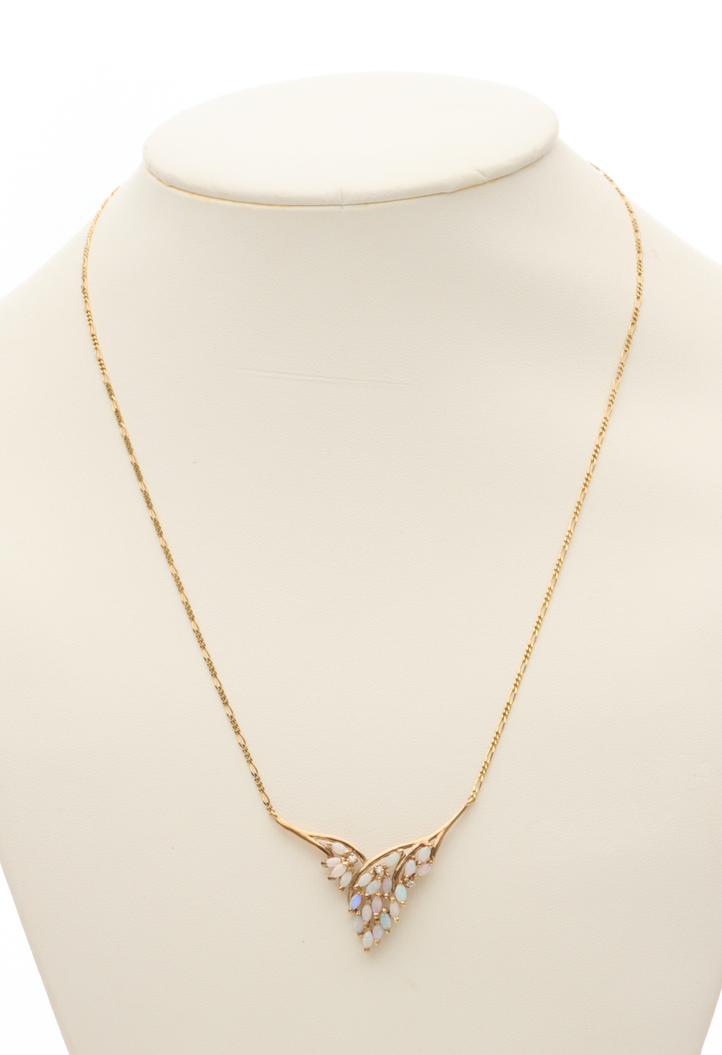 A DIAMOND AND WHITE OPAL NECKLACE IN 14CT GOLD, LENGTH 47CMS, 5.7GMS