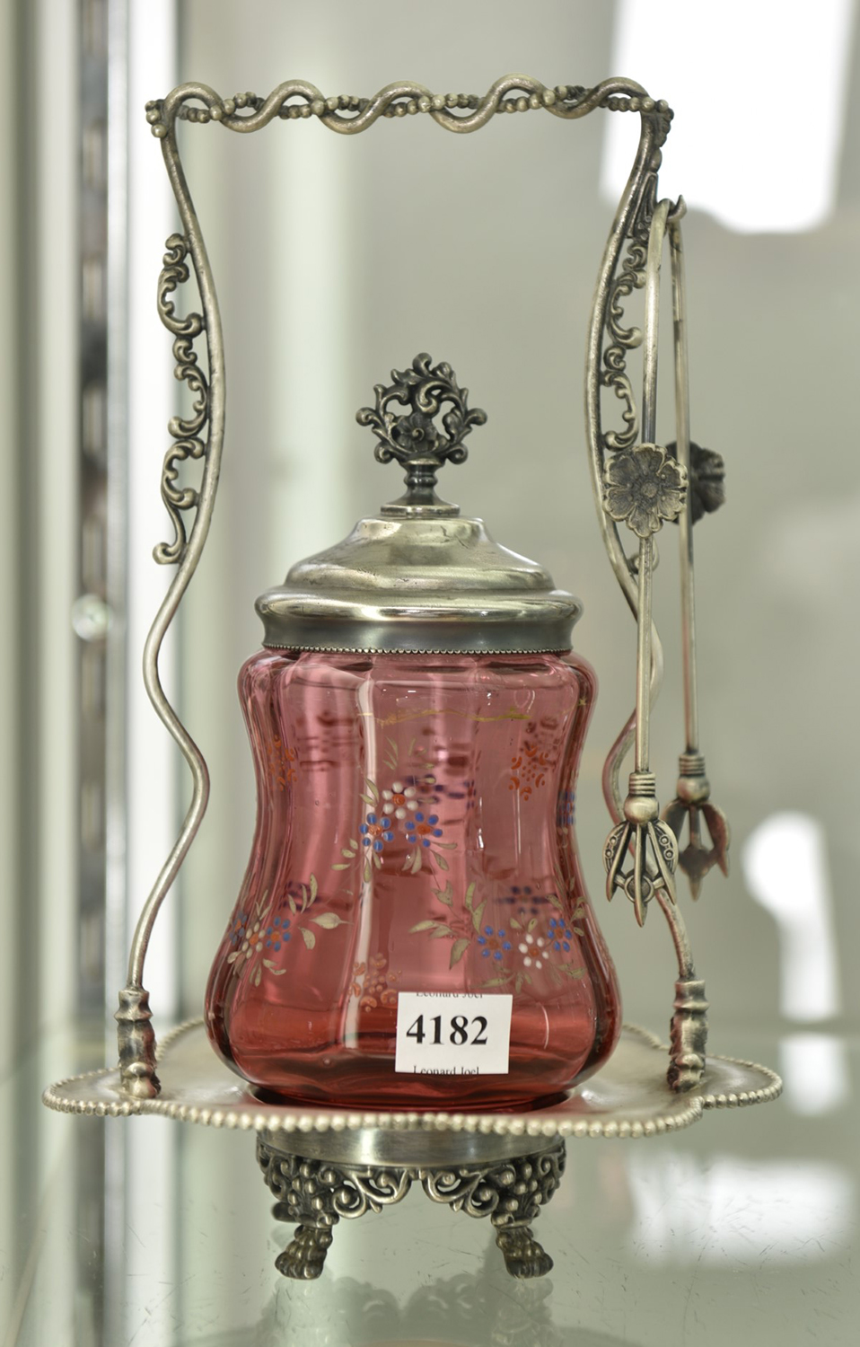AN ANTIQUE RUBY GLASS PICKLE JAR WITH TONGS ON STAND, LEONARD JOEL LOCAL DELIVERY SIZE: SMALL