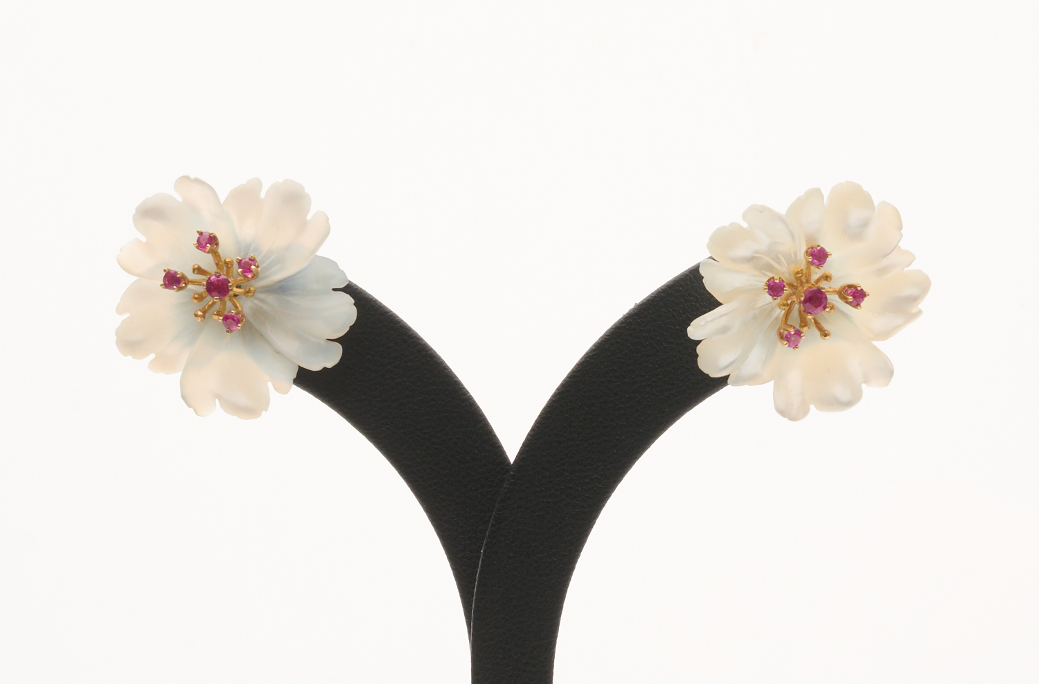 A PAIR OF DETACHABLE FLORAL EARRINGS IN GOLD, COMPRISING RUBY AND MOTHER-OF-PEARL, TO POST FITTINGS