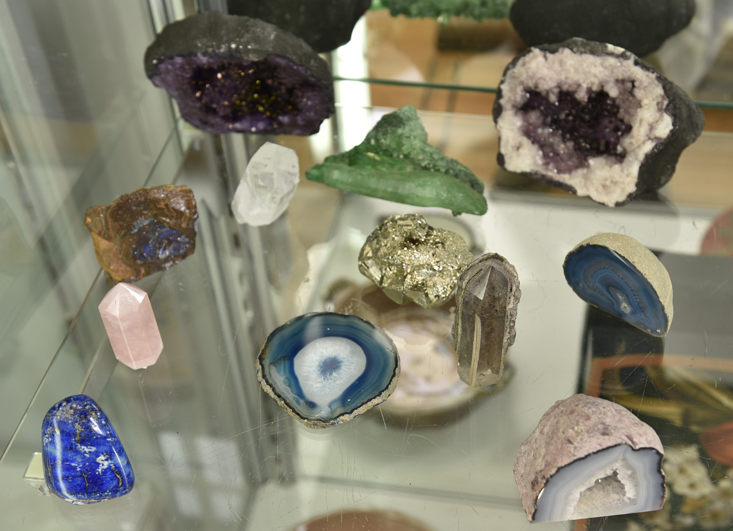A SHELF OF ASSORTED GEMS AND CRYSTALS, LEONARD JOEL LOCAL DELIVERY SIZE: SMALL