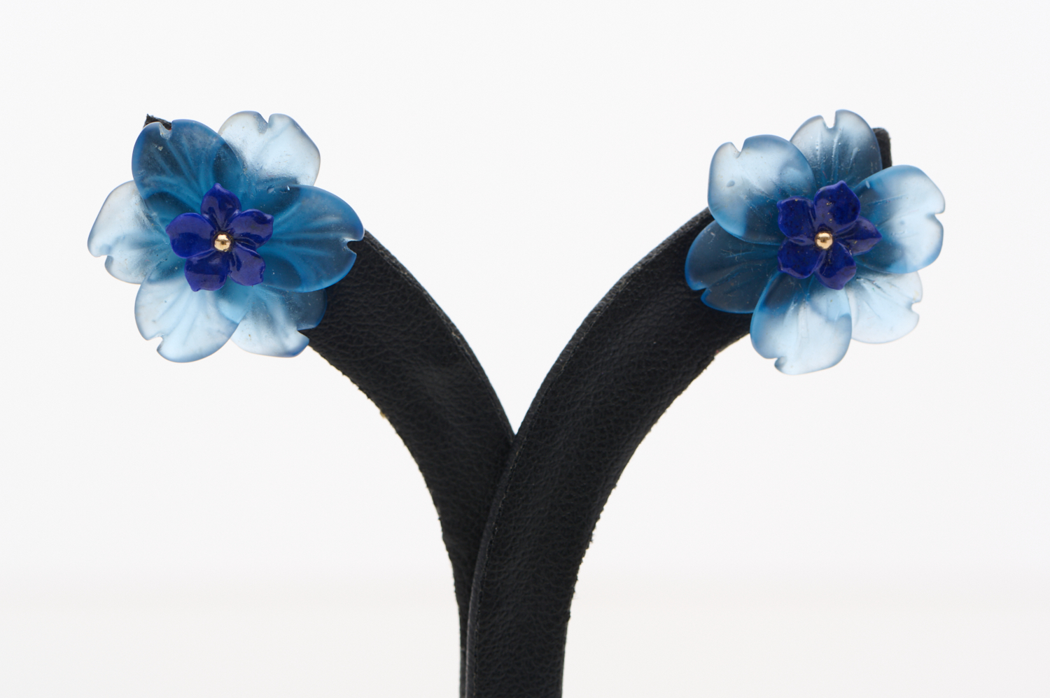 A PAIR OF DETACHABLE FLORAL EARRINGS IN GOLD, COMPRISING LAPIS-LAZULI AND FROSTED BLUE QUARTZ, TO POST FITTINGS
