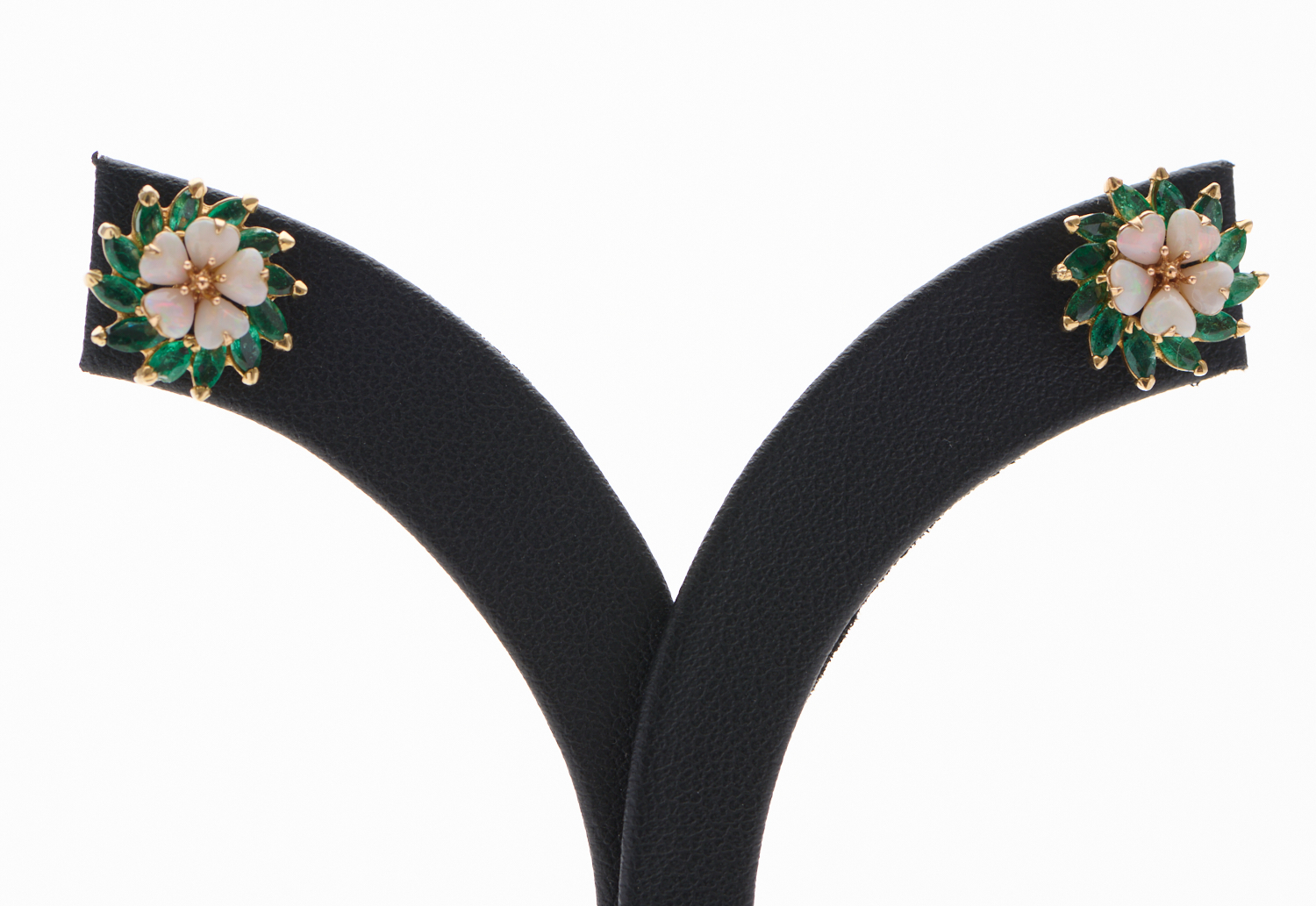A PAIR OF DETACHABLE FLORAL EARRINGS IN GOLD, COMPRISING EMERALD AND OPAL, TO POST FITTINGS, DIAMETER OF THE PLAQUE 15MM