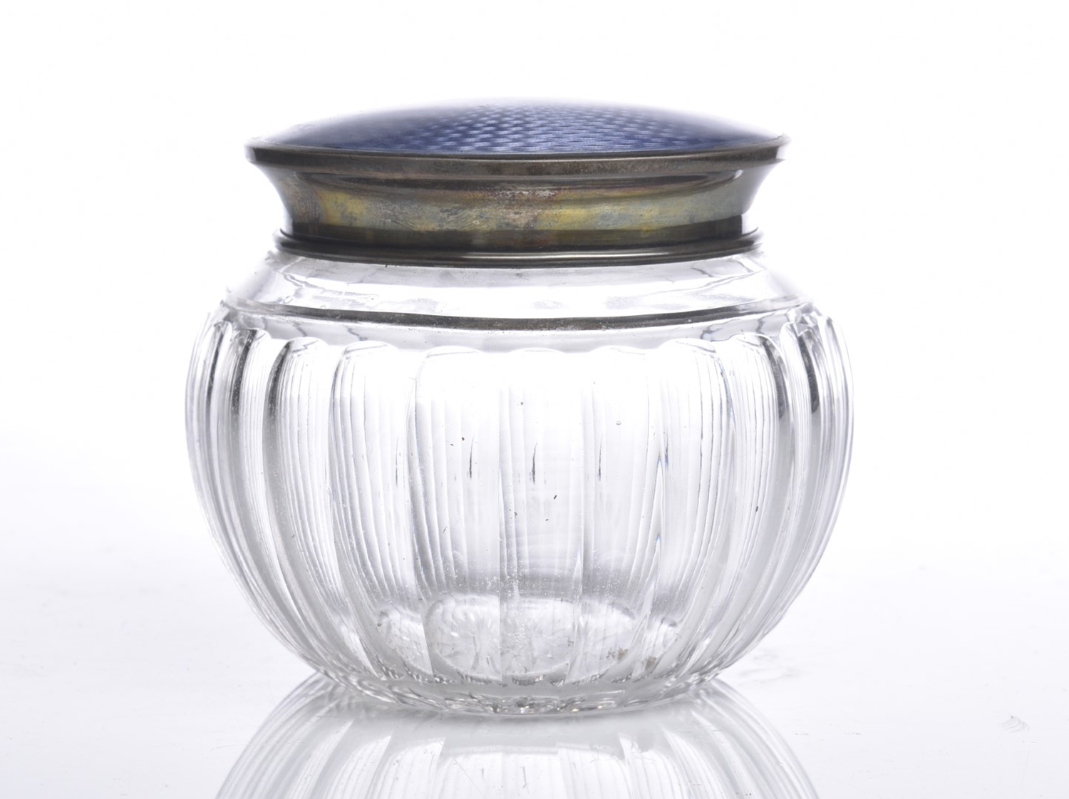 A STERLING SILVER AND ENAMELE GUILLOCHE LIDDED JAR, LEONARD JOEL LOCAL DELIVERY SIZE: SMALL