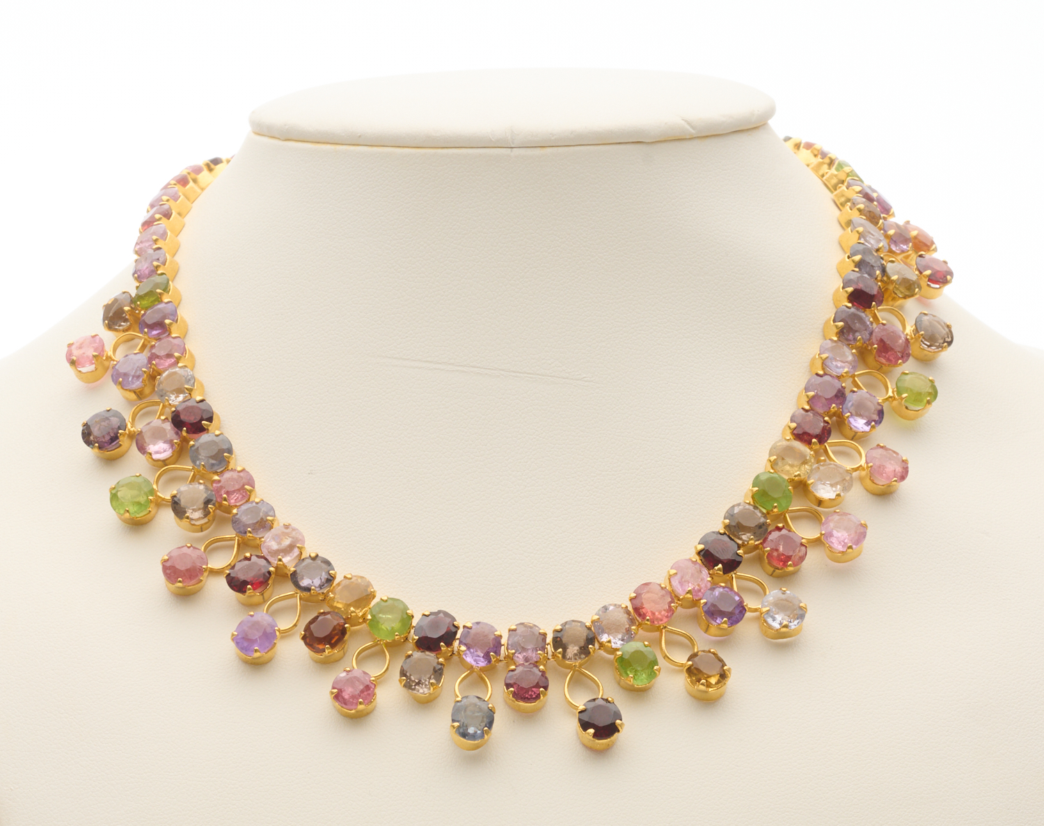 AN IMPRESSIVE GEM-SET NECKLACE FEATURING BURMESE GEMSTONES IN 9CT GOLD, COMPRISING AMETHYST, PERIDOT, TOURMALINE ETC, LENGTH 40CMS, 42.5GMS